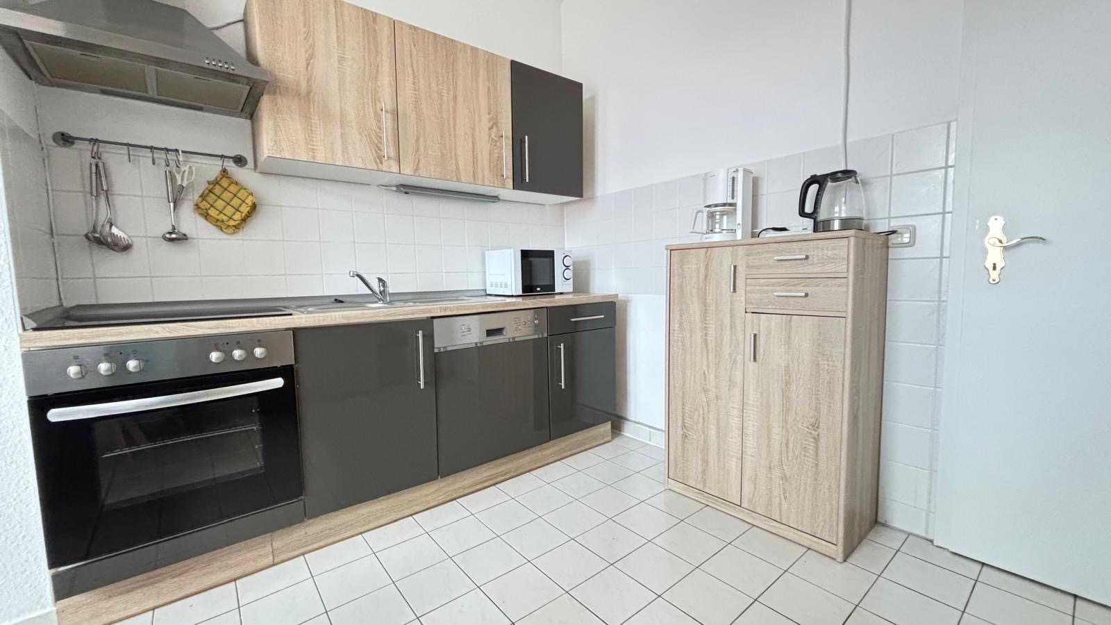 Eine voll ausgestattete Küche mit Kühlschrank, Kaffeemaschine und allem, was Du zum Kochen brauchst